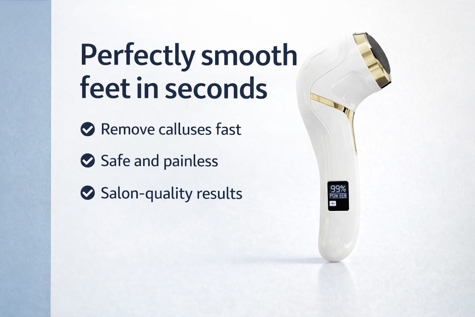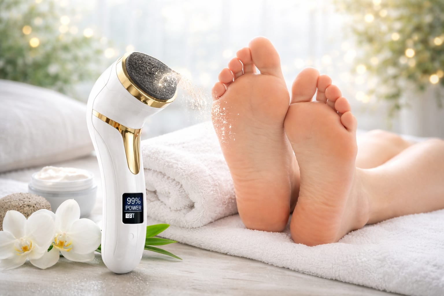 Our electric pedicure grinder removes calluses and hard skin in seconds. Professional salon technology, visible results from the first use. Safe, painless and effective for the whole family.